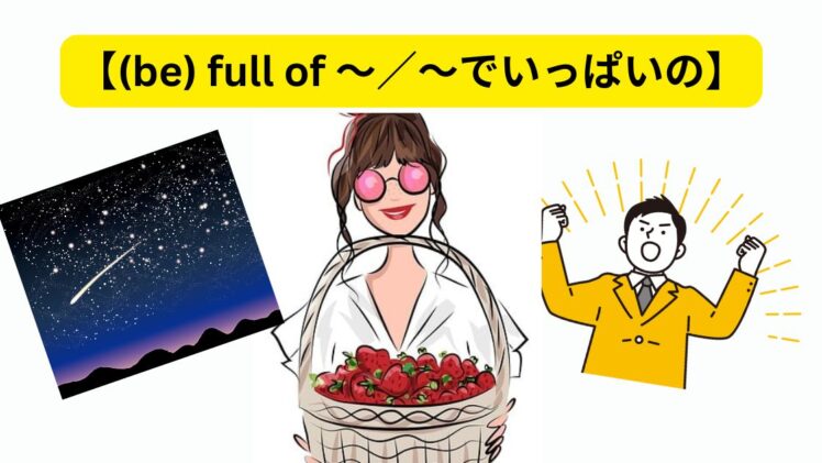 海外生活で学ぶ英語 日常英会話【full of 〜/〜でいっぱいの】の使い方 (be)full of /「〜でいっぱい・満たされている」の表現です。主に「容器や空間があるものでほぼ完全に満たされている」或いは「強い関心、興奮状態」の時に使われます。ネィティヴがどのような場面、状況時に使っているのか実例を挙げて紹介します。 2026.02.01 海外生活で学ぶ英語